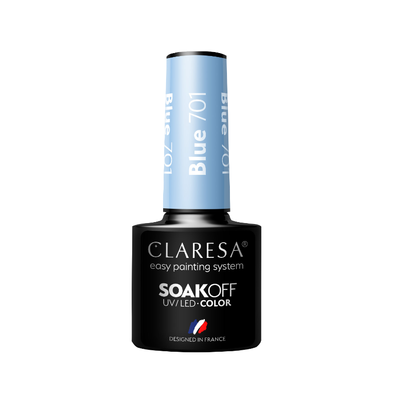 CLARESA Blue 701 is een poederblauwe pastel gellak met hoge pigmentatie en tot 3 weken draagplezier. Perfect voor zachte, stijlvolle nagels.