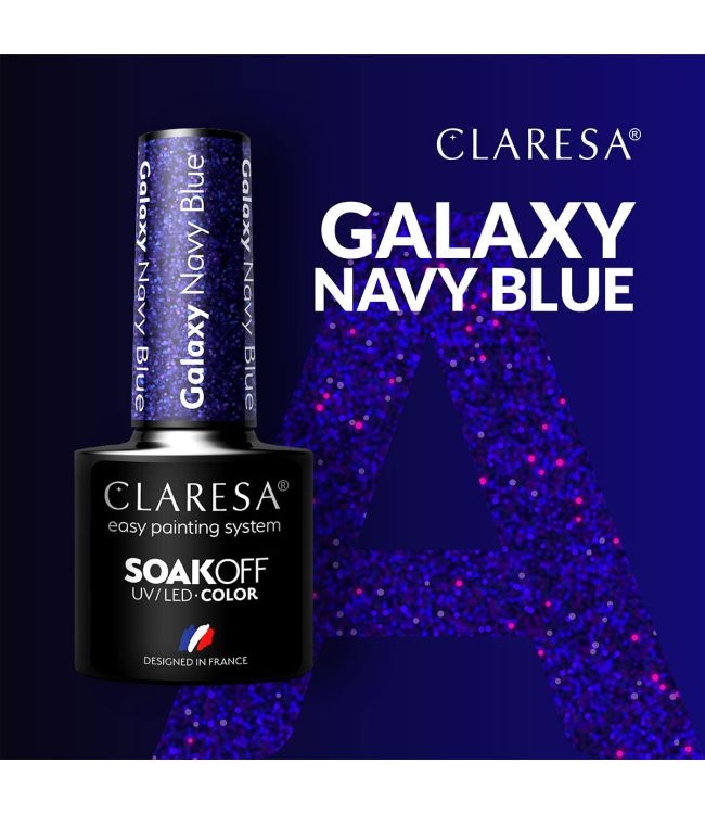 CLARESA Galaxy Navy Blue is een intense donkerblauwe gelnagellak met sprankelende glitterdeeltjes die doen denken aan een heldere sterrenhemel. Deze kleur combineert een diepe navy basis met subtiele glinsteringen voor een luxe en mysterieus galaxy-effect.