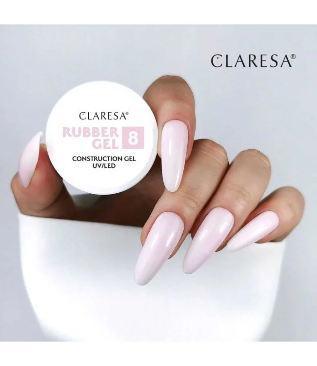 Claresa Rubber Gel 8 Ballerina Pink 12gr. is een zeer resistente en gemakkelijke bouwgel in een heel lichtroze kleur met een koele ondertoon om de nagels te verlengen, versterken en modelleren.