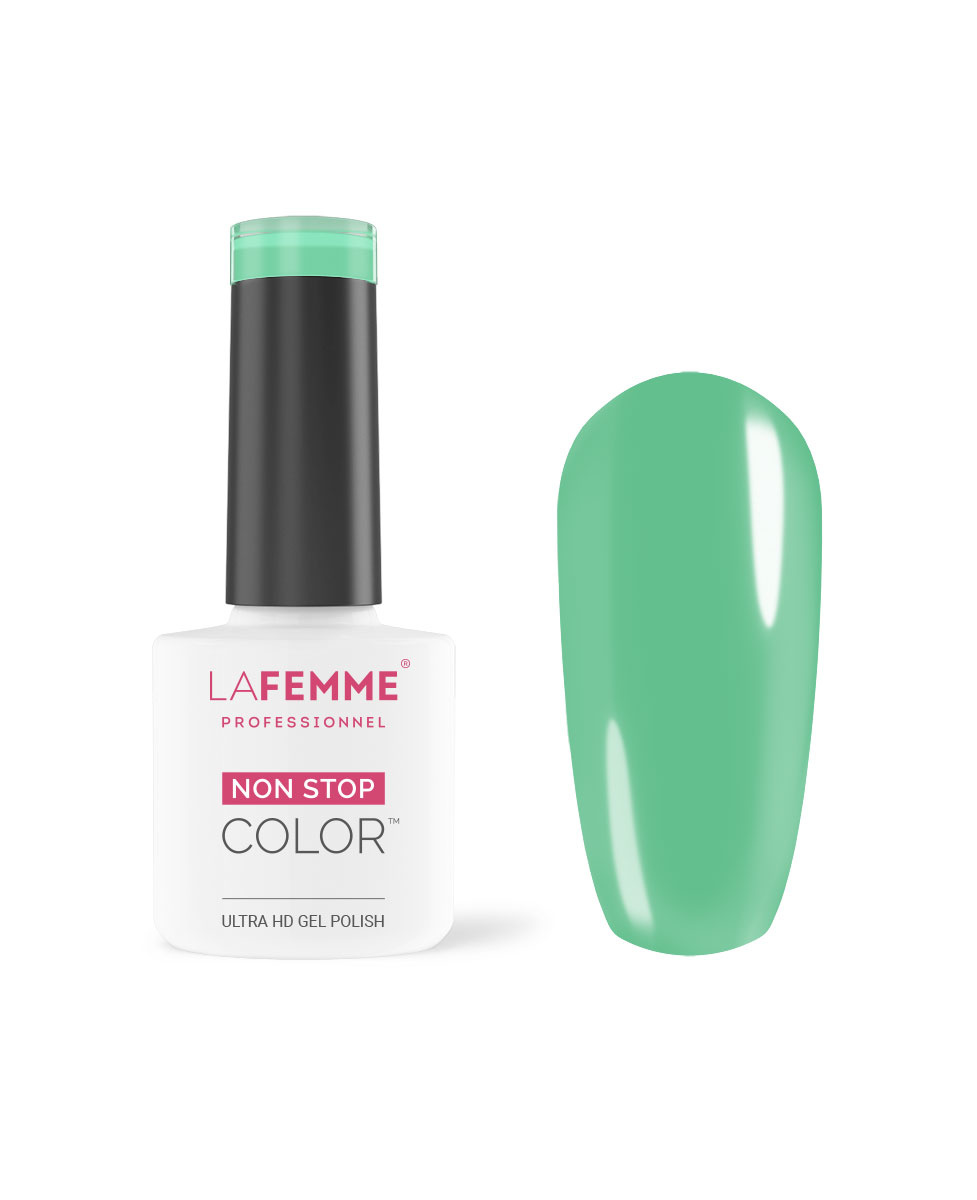 De speciale formulering van deze semipermanente Gel Polish zorgt voor een perfecte verbinding met het oppervlak van de natuurlijke nagel en creëert een gladde structuur. Gel Polish versterkt en beschermt de natuurlijke nagel. De polymerisatie geeft de perfecte hardheid en daardoor blijft de Gel Polish meer dan 3 weken zitten. Gel Polish heeft een sterke weerstand tegen krassen en slijtage. Non Stop Color Gel Polish kan bovendien gemakkelijk worden verwijderd in 5-10 minuten. Dit is afhankelijk van het type gel verwijderaar dat je kiest. De Gel verwijderaars van La Femme zijn verrijkt met lanoline of capryl-extract, dit voorkomt overmatige uitdroging van de huid en natuurlijke nagels.