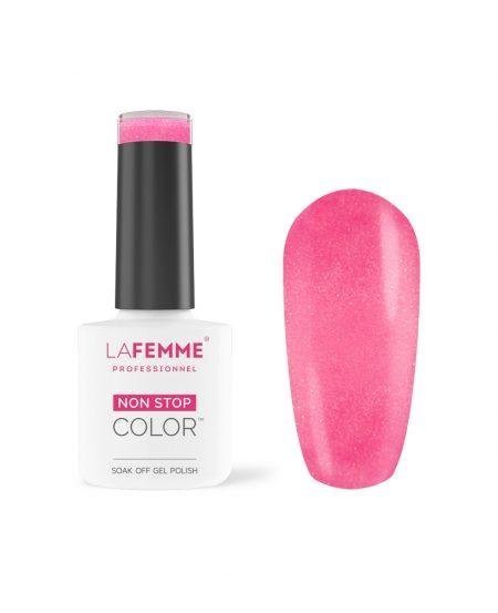 De speciale formulering van deze semipermanente Gel Polish zorgt voor een perfecte verbinding met het oppervlak van de natuurlijke nagel en creëert een gladde structuur. Gel Polish versterkt en beschermt de natuurlijke nagel. De polymerisatie geeft de perfecte hardheid en daardoor blijft de Gel Polish meer dan 3 weken zitten. Gel Polish heeft een sterke weerstand tegen krassen en slijtage. Non Stop Color Gel Polish kan bovendien gemakkelijk worden verwijderd in 5-10 minuten. Dit is afhankelijk van het type gel verwijderaar dat je kiest. De Gel verwijderaars van La Femme zijn verrijkt met lanoline of capryl-extract, dit voorkomt overmatige uitdroging van de huid en natuurlijke nagels.