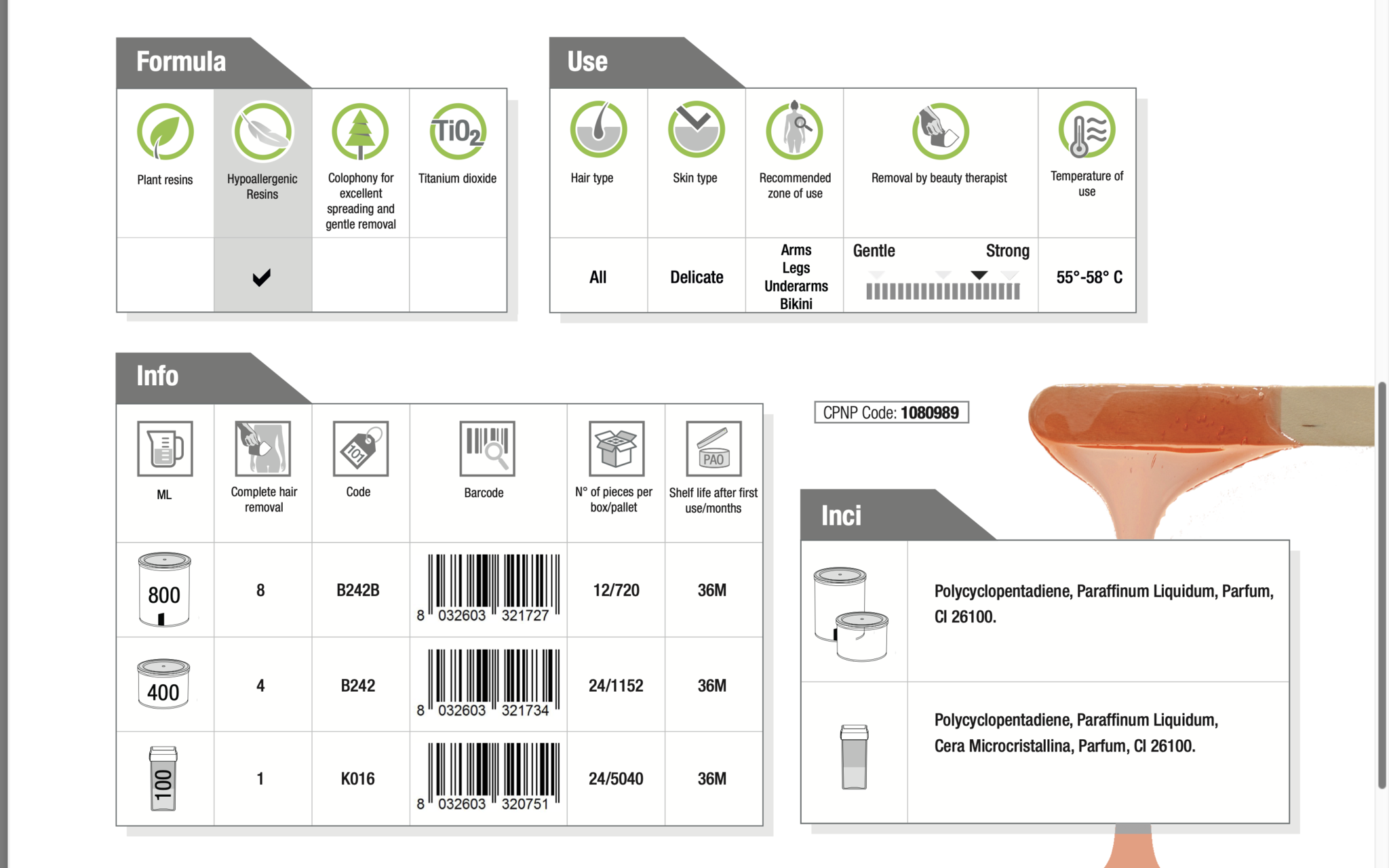 De formule bevat hypoallergene harsen en is vrij van titanium dioxide, waardoor een stevigere en strakkere verwijdering ontstaat.