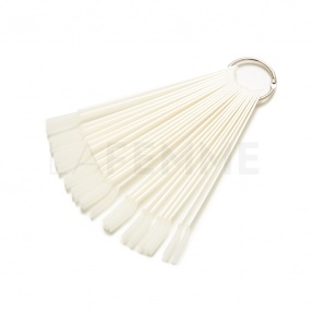 Kleurensjabloon in de vorm van een waaier, bedoeld voor de presentatie van kleuren en nageldecoraties. De metalen hanger biedt plaats aan 24 naturelkleurige spatels, het is mogelijk om meerdere spatels te bevestigen. Totale lengt