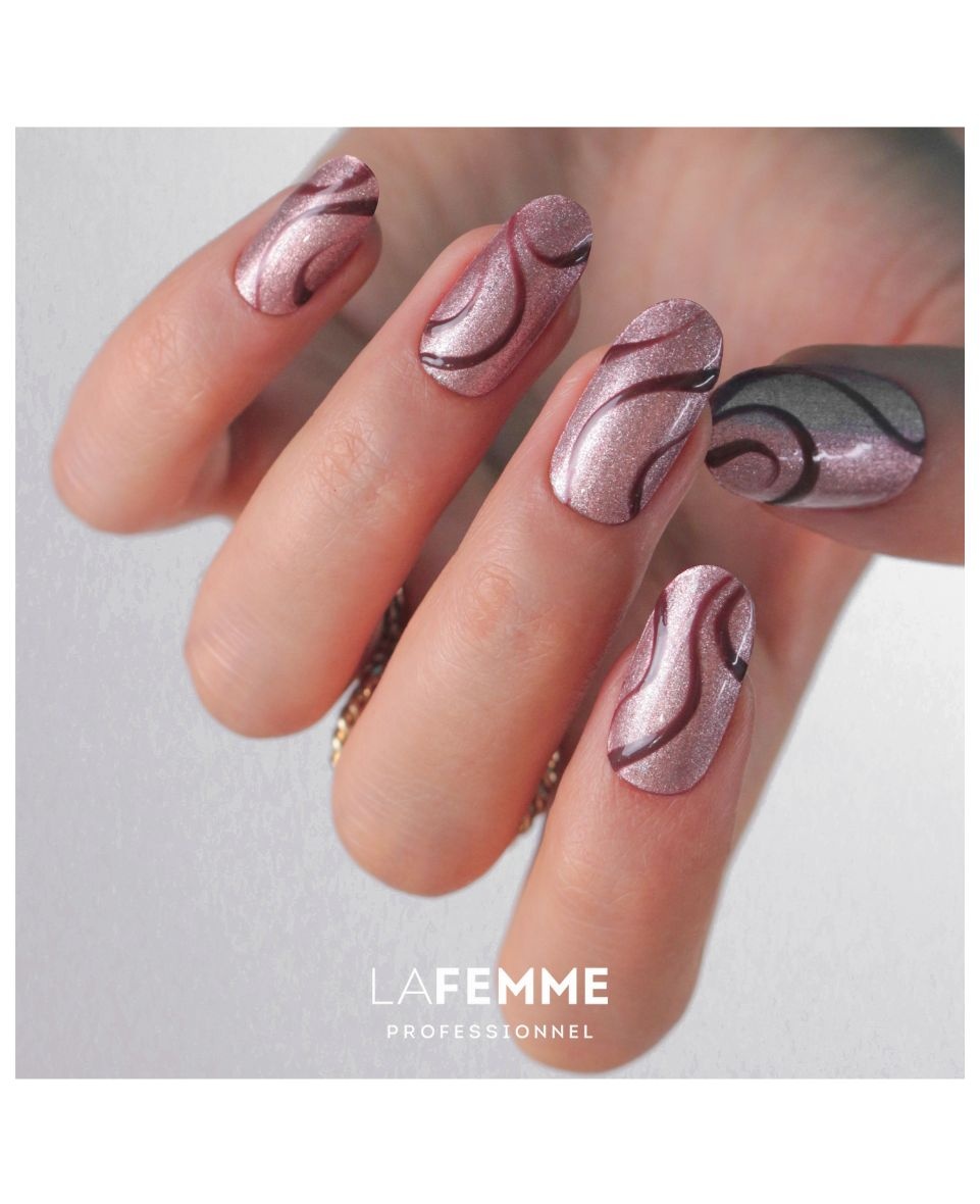 De **La Femme H407 Aube Dorée** uit de **Palette Parisienne – Autumn 2025** collectie is een semipermanente lak met een verfijnde “glitter rose gold” (oro rosa) finish. Deze kleur combineert elegantie en glamour voor manicure looks met een sprankelend accent.