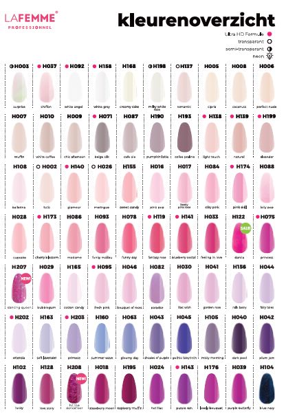 NSC (Non Stop Color) Gel Polish is de trend in het lakken van nagels. Met NSC Gel Polish van La Femme Professionel beschik je over een ruime keuze van 200 verschillende kleuren. NSC Gel Polish heeft een hoogwaardige hechting, dat wekenlang draagplezier garandeert. De Gel Polish hecht perfect op de natuurlijke nagels van handen en voeten. Je kunt NSC Gel Polish ook aanbrengen op kunstnagels zoals Acryl nagels en Gel nagels of op de Spheric Acrylgel™ van La Femme.