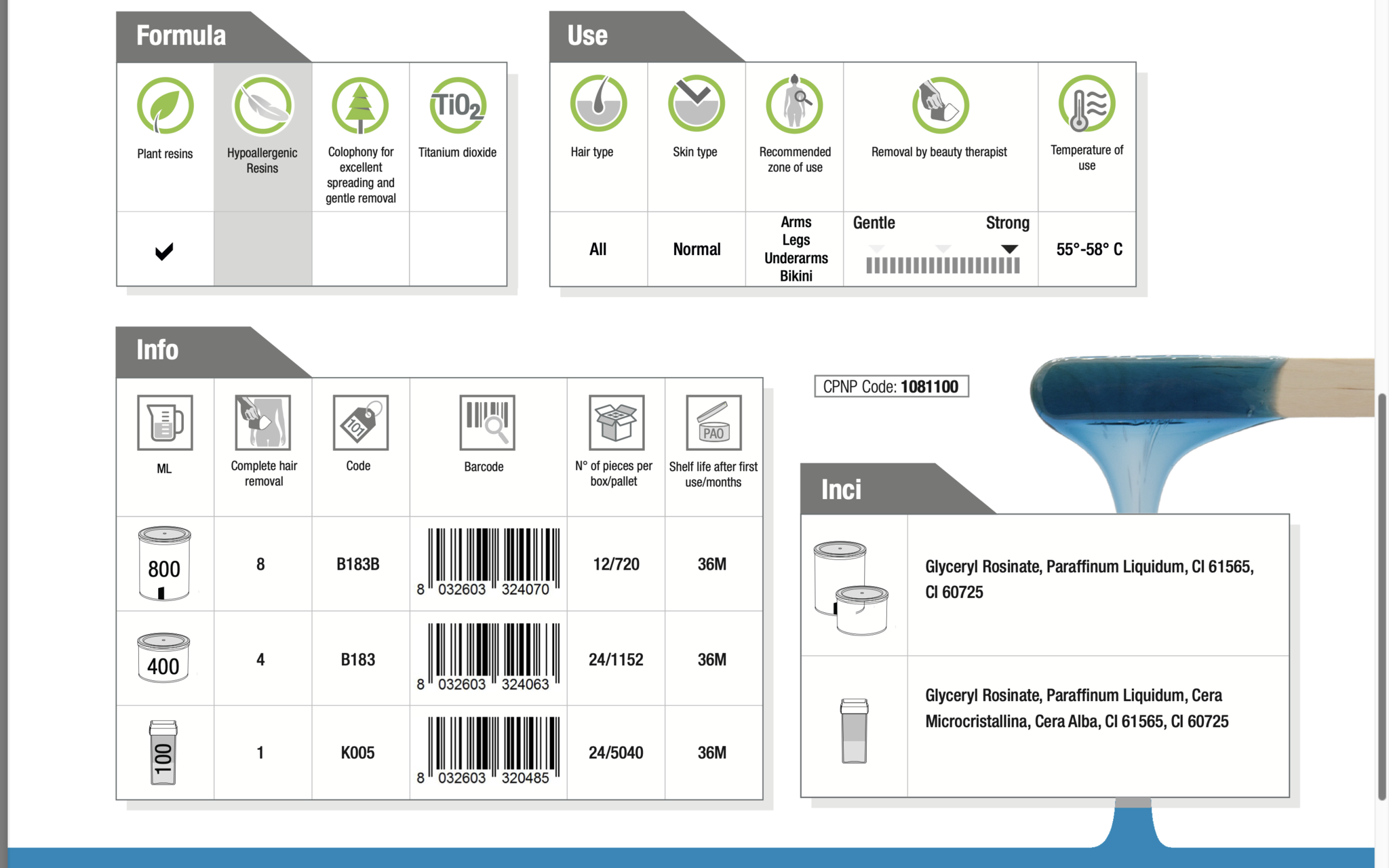 De formule is ontwikkeld voor snelle, efficiënte ontharing en gelijkmatige spreiding. De wax heeft een diepe blauwe kleur en een soepele textuur.