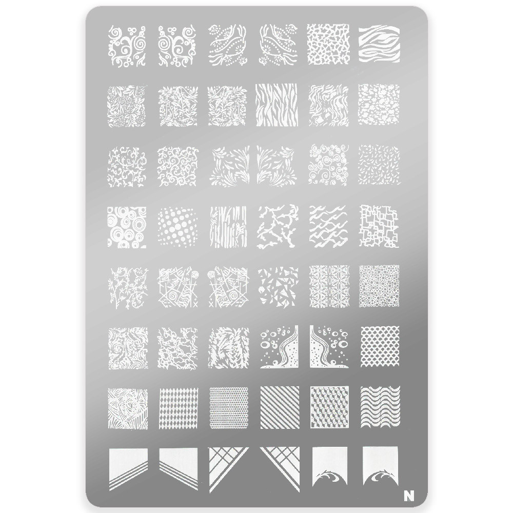 Een plaat bedoeld voor het stempelen van patronen op nagels. Een snelle en zeer gemakkelijke vorm van precieze nageldecoratie met behulp van zowel hybride als traditionele nagellakken speciaal voor deze methode. Kies uw ontwerp uit een enorm assortiment tegels en verras met een unieke manicure.
